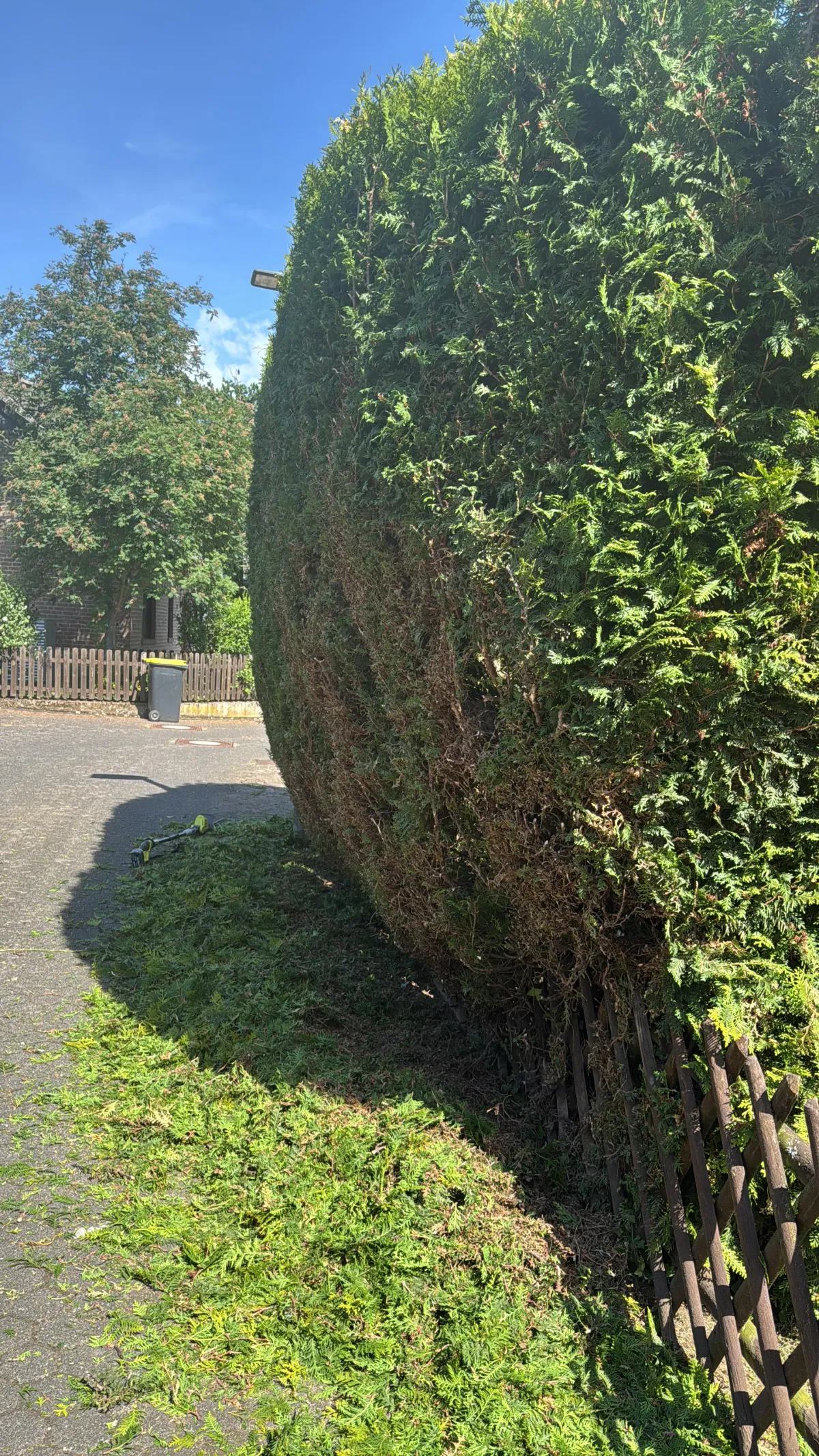 Wir übernehmen Rasen- und Beetpflege, Hecken- und Baumschnitt, Pflasterarbeiten, Zaunbau, Terrassenpflege und saisonale Arbeiten wie Laubentfernung.